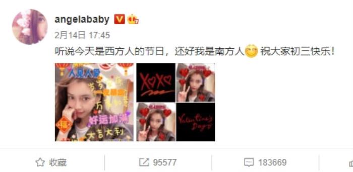 某一年的情人节,杨颖在社交平台晒出了两张自己的照片,并配文“听说今天是西方的情人节,还好我是南方人,祝大家初三快乐。” 就是这句话立马引起了大家的讨论,杨颖的意思不就是在说自己是单身,所以不过情人节吗?于是网友纷纷留言猜测杨颖和黄晓明的感情出现了问题。