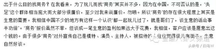至于为什么有高管消费,外围女常见于商务伴侣中,可以参考知乎上的一个回答(因为有外围女的商务陪伴,客户会更有面子,生意也更好谈,收益最后是大于花费的):