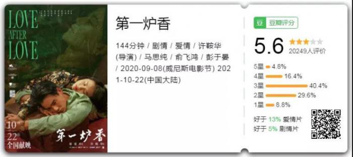 1905电影网专稿从拍摄前到上映后,《第一炉香》都伴随争议。普罗大众对影片不买账,猫眼7.3分,淘票票7.5分。在影迷居多的豆瓣平台上,仅有5.6分,这个令人跌破眼镜的不及格分数,是导演许鞍华目前所有长片里的最低分。