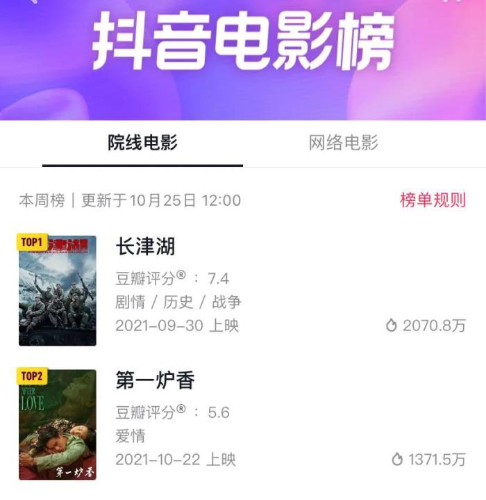 而这些电影都是爱情题材,很容易在短视频平台上转换成具有传播力的话题点,触发用户的情感共鸣,从而再转化到电影票房本身。