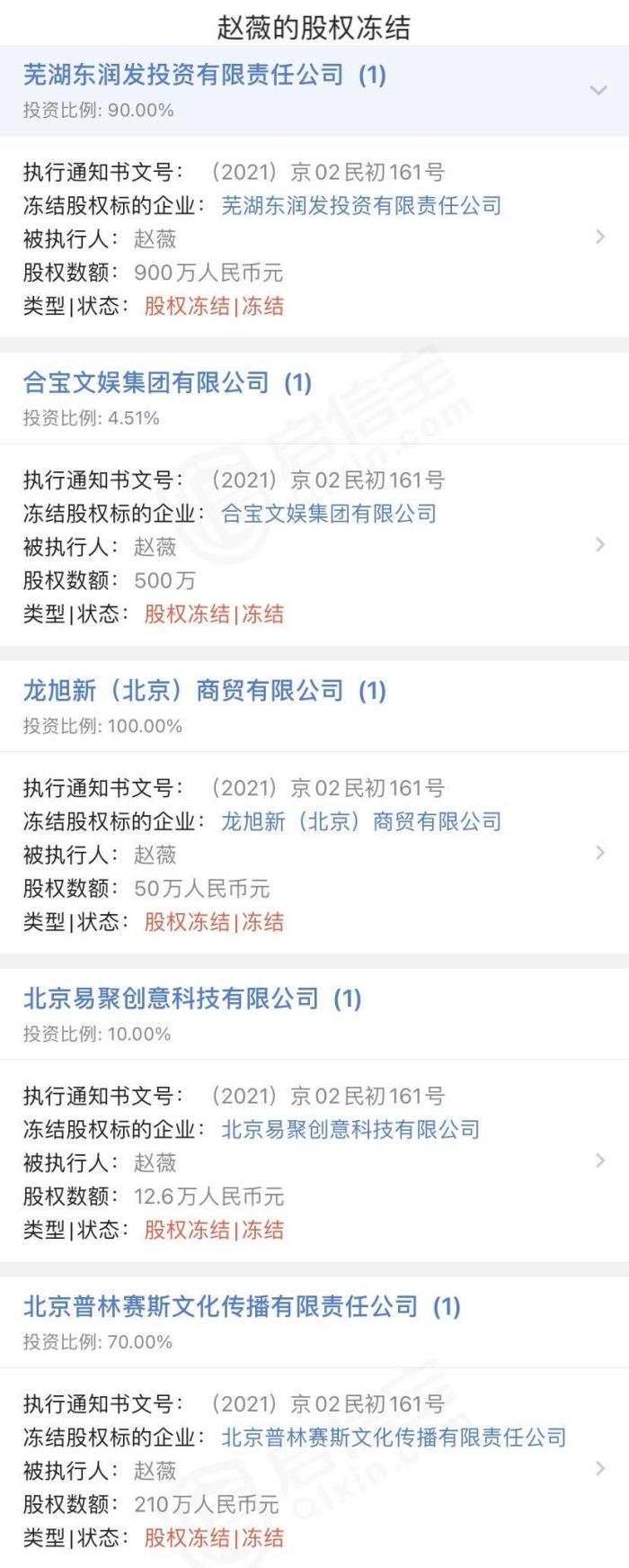 北京普林赛斯文化传播有限责任公司,赵薇投资比例70%并担任监事,被冻结股权210万元;北京易聚创意科技有限公司,赵薇投资比例10%,被冻结股权12.6万元;龙旭新(北京)商贸有限公司,赵薇投资比例100%并担任监事,被冻结股权50万元;合宝文娱集团有限公司,赵薇投资比例4.51%,被冻结股权500万元;芜湖东润发投资有限责任公司,赵薇投资比例90%,被冻结股权900万元。合计被冻结股权金额达1672.6万元,被冻结期限均为1095天(3年)。
