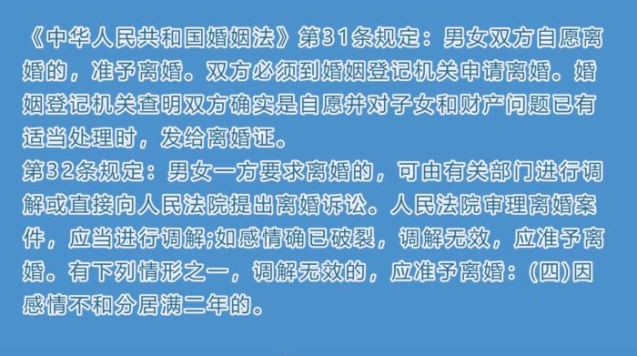 第32条 男女一方要求离婚的,可由有关部门进行调解或直接向人民法院提出离婚诉讼。人民法院审理离婚案件,应当进行调解;如感情确已破裂,调解无效,应准予离婚。有下列情形之一,调解无效的,应准予离婚:(四)因感情不和分居满二年的。