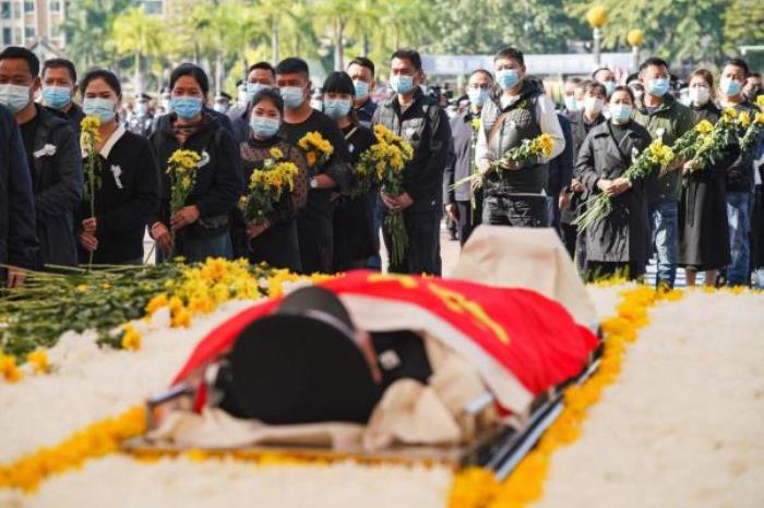 12月8日上午10时30分,边境缉毒英雄、移民管理警察蔡晓东同志遗体送别仪式在云南省西双版纳州景洪市泼水广场举行。
