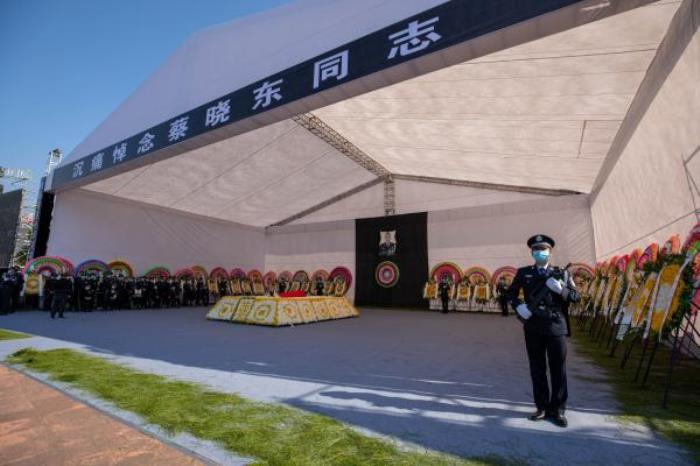 绢花朵朵,泪光闪闪,哀乐低徊,送别人员向蔡晓东同志遗体默哀、鞠躬,敬献鲜花。