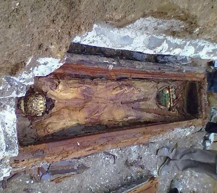 打开了棺椁之后是一具保存得比较完好的遗体,在遗体上面放了棉被,把遗体盖得严严实实。此时的考古队员想要移动一下遗骸,但是没想到当他们的手伸到身体的部位时,摸到的却是一把泥土,因为在被子底下根本就没有什么遗骸,而是只有一个空灵灵的头骨。说白了这个墓主人身首异处。