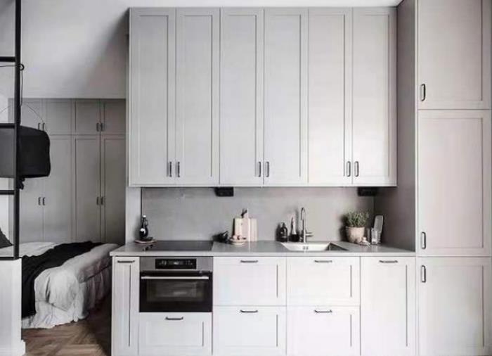 通顶的隔断壁柜将纵向空间进行拉伸,不仅提高了储物空间,也让整体的简约大方之感彰显了出来。壁柜下侧是厨房,一字型的厨房空间并不是很大,但是好在是够用的。