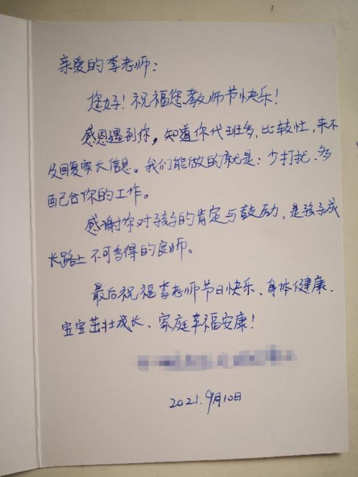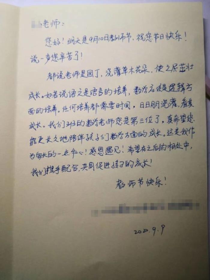 大家有没有在言语里看到作为父母的拳拳之心啊!最后问大家,今天你们给自己的老师或者孩子的老师送的是贺卡还是什么礼物?你们的祝词是自己写的还是网上抄的?
