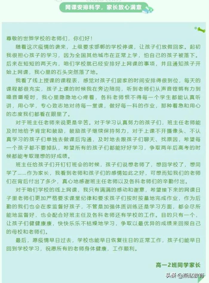 疫情无情,网课有爱,一路坚守,逐梦不歇!近期,疫情反复,邯郸冀南新区世骅学校严格贯彻防疫要求,高中全体学生离校居家。在这场“离校不离教,停课不停学”的战“疫”中,老师们的辛苦付出和细心负责,得到了家长的肯定,收获了来自家长的满满的欣慰和感动。