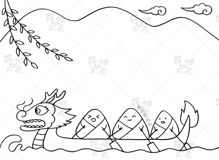 我们可以在画面下方绘制一条龙舟,再绘制几个划船的粽子,用山川来作为文字框,用白云和柳叶来装饰,这样的手抄报是不是简单又好看呢?