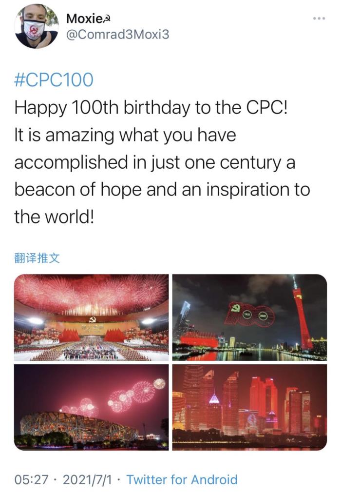 有美国网友发推祝贺:“中国共产党100岁生日快乐!你们在短短一个世纪内取得的成就令人惊叹,是希望的灯塔,也是对世界的鼓舞!”↓