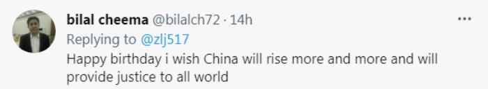 “生日快乐,祝中国越来越强大,为全世界伸张正义。”