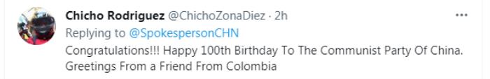 “祝贺!!!中国共产党百岁生日快乐。来自哥伦比亚朋友的问好。”