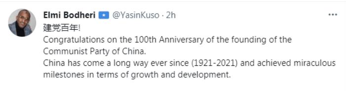 有肯尼亚网友还用中文写下“建党百年”向中国共产党送上祝贺:“祝贺中国共产党成立100周年。从1921-2021年,中国走过了漫长的道路,在(经济)增长和发展方面取得了奇迹般的里程碑式(成就)。”↓