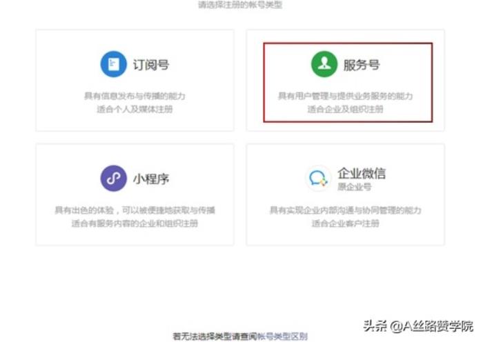 然后选择账户类型,选择分别有:订阅号、服务号、小程序、企业微信。