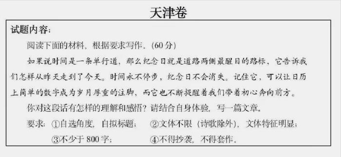 分析:除上述四套全国卷的高考作为题目以外,其他四套地方的高考试卷也没有偏离青年人的责任与担当的主题,分别是北京卷以“论生逢其时”“这才是成熟的模样”,上海卷的“时间的沉淀对事物的价值”的看法,天津卷的,“时间是单行道,但是纪念日是最醒目的路标”以及浙江卷的“得与失”。