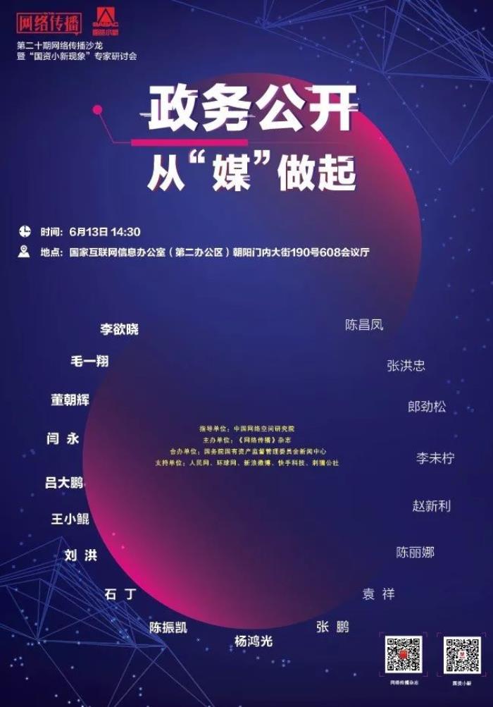 6月13日,由中国网络空间研究院指导、《网络传播》杂志主办的第二十期网络传播沙龙暨“国资小新现象”专家研讨会在北京市东城区朝阳门内大街190号厅举行,主题为“政务公开,从‘媒’做起”。政企媒学13位业界大咖和知名专家,聚焦“国资小新现象”,以“国资小新”等为研究对象,进行了深入研讨交流,总结政务新媒体运行发展规律,共同探讨政务新媒体如何进一步推动政务公开、提升政务服务能力,走好网上群众路线。