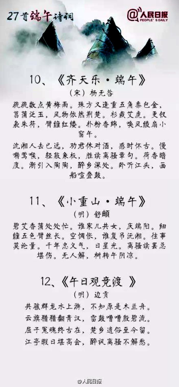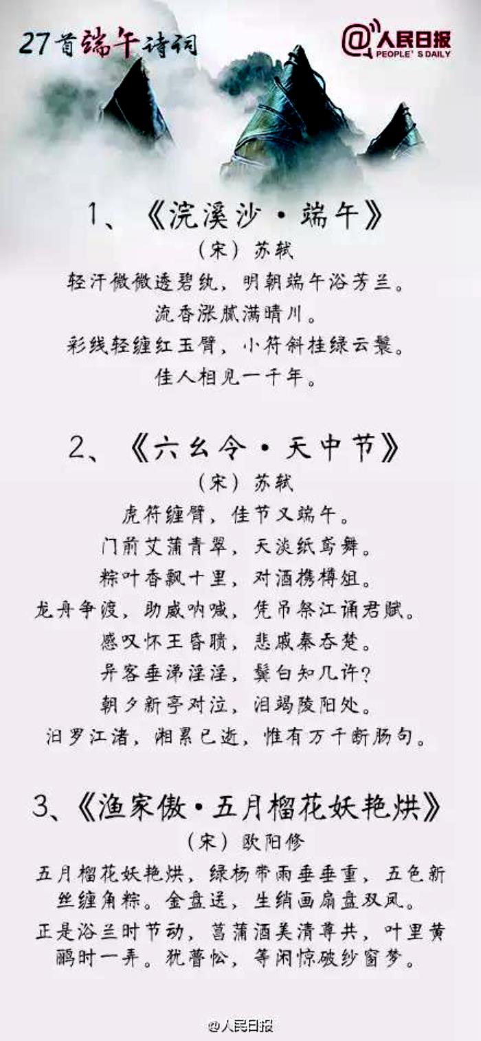 今天,父母微课堂特意为大家整理了人民日报推荐的跟端午节相关的古诗词27首,一起来读读吧!