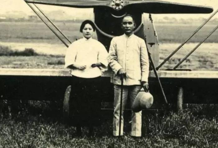 孙中山和宋庆龄在“乐士文号”飞机前留影。