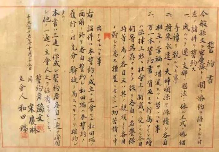 图为孙中山与宋庆龄的结婚誓约书,证婚人为日本律师和田瑞。
