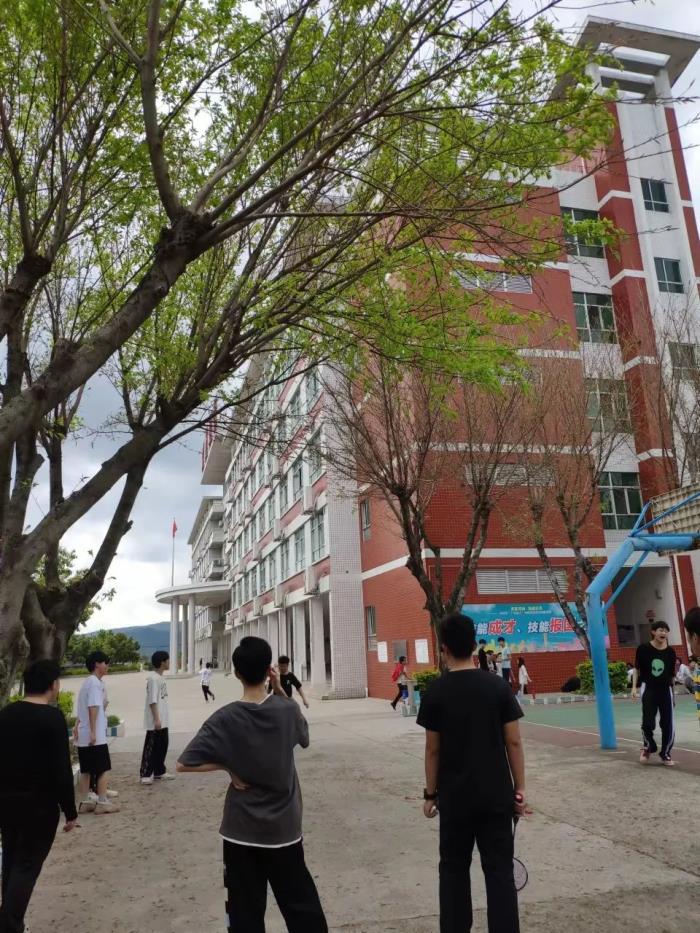 一入校园左边是一排高大的芒果树,现在正是初春,青绿的树冠上开满一簇簇黄褐色的小花,花香四溢蜂蝶飞舞。