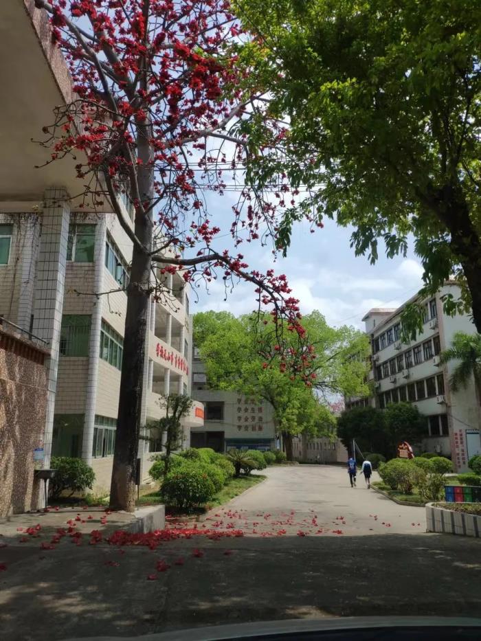 在香樟树和秋阳教学楼之间,有两株高大的木棉树,校园里有很多很大的木棉树,春天开一树繁花,火红的颜色像一束束巨大的火炬。一阵风吹过,木棉花纷纷坠落,不一会儿地上铺满一地的落英,像铺了一张火红的地毯,美丽极了。秋阳教学楼后面是诗五教学楼,楼前也有两株巨大的木棉树,树根把花池都撑裂开来,树冠高达三楼的楼顶,年年开一树繁花,今年花开依旧,只是新教学楼启用后,秋阳楼和诗五楼都已经闲置多年,独留一地繁花在那里引人驻足引人回望。从远处看学校,香樟翠绿,木棉火红,火红的木棉像燃烧着熊熊的火焰,又像一朵朵红花点缀在绿叶中,把大地,把天空装扮得鲜艳夺目。城西的木棉树最大的需要两人才能把它合抱起来,看见那木棉树,你会不由自主地想:这木棉树的年龄应该跟学校年龄一样老吧。