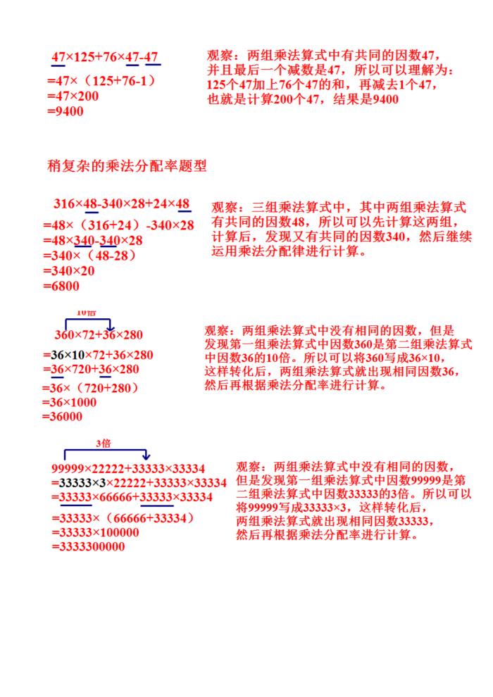 针对第一种情况的解决办法:观察乘法结合律和乘法分配率字母公式,发现乘法结合律中只有一种符号:乘号,当三个或三个以上数连乘时,一般适合乘法结合律。乘法分配律字母公式中不只有乘号,还有加号或减号,所以当符号不止乘号一种时,可以考虑乘法分配率。两个数相乘时,也可考虑乘法分配率。