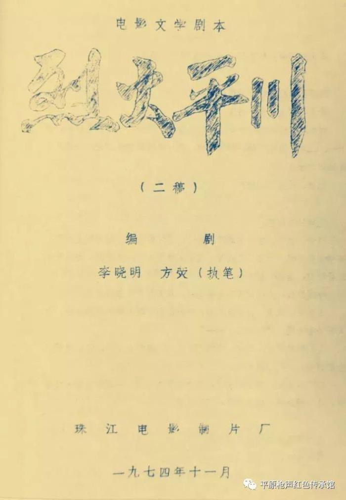 本馆不仅藏有1959年12月,根据小说改编的电影文学剧本《平原枪声》原件,编剧李晓明、韩安庆,出品单位:长春电影制片厂;今又有幸收藏到1974年11月根据《平原枪声》小说改编的电影文学剧本《烈火平川》影印件,编剧李晓明、方荧(执笔),出品单位:珠江电影制片厂。该剧本丰富了我馆馆藏内容,为弘扬《平原枪声》精神,传承红色基因奠定了基础。同时,也为已故著名作家李晓明作品展柜中增添一新展品,以此方式表达对这位人民作家的怀念!