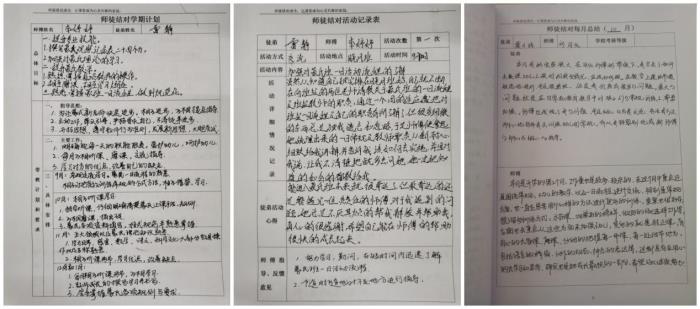 师徒结对后,师傅和徒弟会拥有一本共同的师徒结对手册,在上面记录平时的交流与学习,具体的学习内容,从徒弟的认识再到师傅的详细指导,一个月学习到的内容以及徒弟与师傅各自的学习成长总结,全部通过文字的形式记录在册。从一行行的文字可以看出徒弟平时学习的认真与努力,还有师傅的细心、用心的指导,她们成长了。