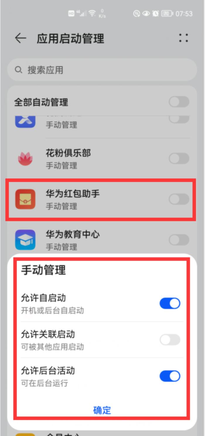 然后点击“应用启动管理”,就会显示所有的应用程序(如下图)。找到“华为红包助手”,点击它右侧的开关,就会在屏幕底部弹出“手动管理”的开关。