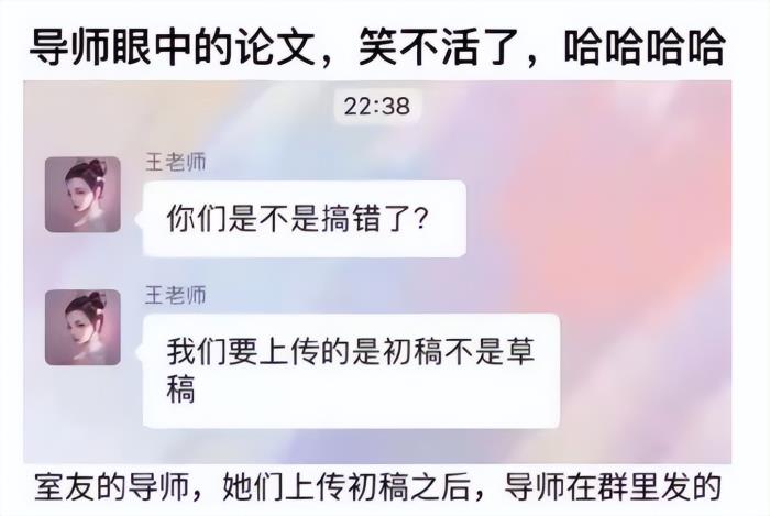 可不知道是不是对自己的“徒弟”过分自信,导师看完学生交出的论文后,顿觉眼前一黑,有种吐血三升的感觉,最后咬牙切齿的在群里发了一句:“我们要上传的是初稿,不是草稿啊!”