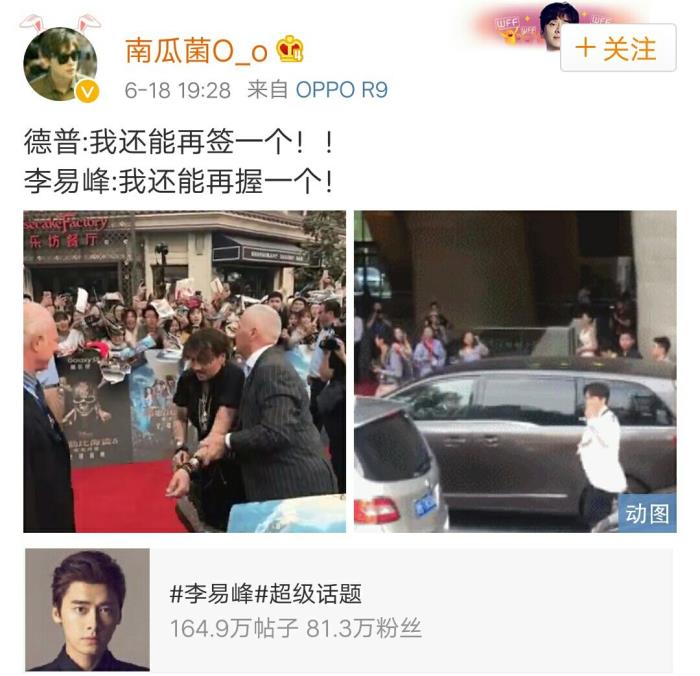 有粉丝就联想到早前强尼德普来华出席活动时使出全身力气为粉丝签名的样子,此次峰峰也是不遑多让,大概两人内心的os都是一样的吧:放开我!我还能签/击掌。
