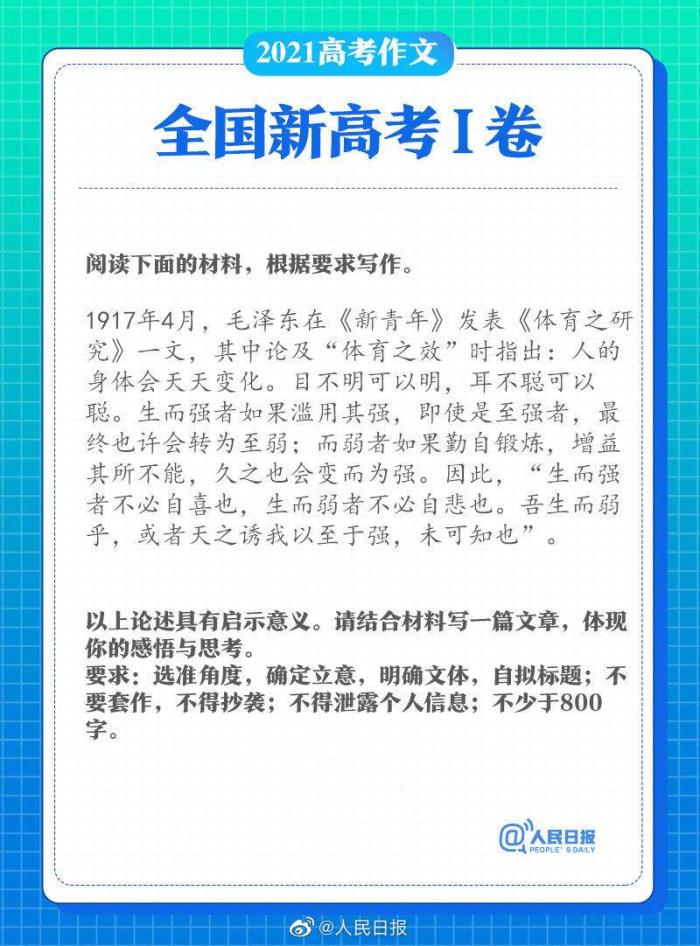 对此,“太巧了,我这段时间正在追《觉醒年代》,刚刚看过毛泽东写文《体育之研究》这一集,今天作文就考了。”有考生王同学就告诉记者,因为刚看完电视剧,所以对这一作文题目还是比较熟悉,写作时从个人和国家的层面都分别进行了论述。