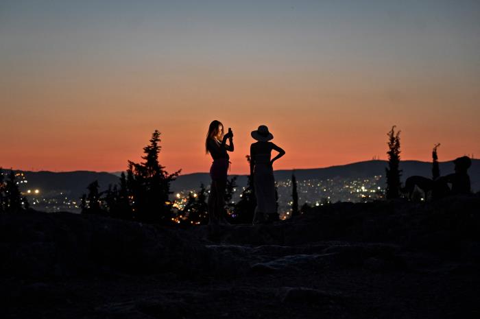 6月21日,人们在希腊雅典附近的落日余晖中留影。 新华社/法新