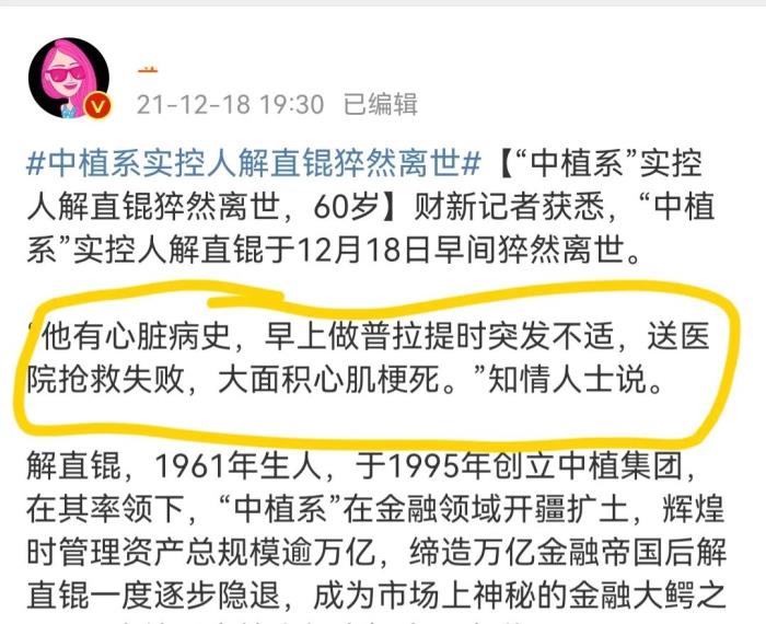 【本文主笔:安宁】#中植集团实控人解直锟去世#