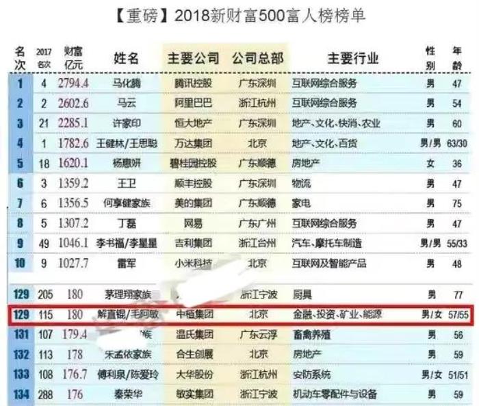 解直锟的财富到底有多少?外界根本算不出来。可以检索到的资料是,2018年,在胡润富豪榜上,解直锟和老婆毛阿敏的名字,赫然在列。