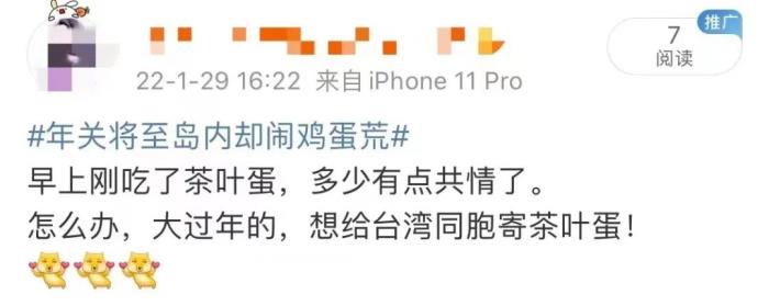 还有网友说,“怎么办,大过年的,想给台湾同胞寄茶叶蛋!”