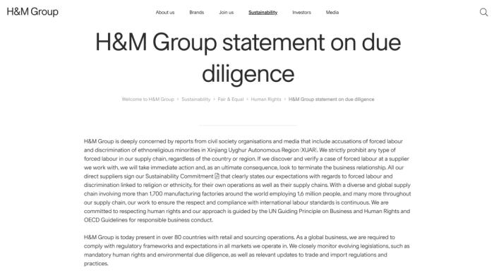 首先引起众人愤怒的原因,就是H&M集团以“强迫劳动为借口”,提出了一份要拒绝使用并抵制新疆棉花的声明。
