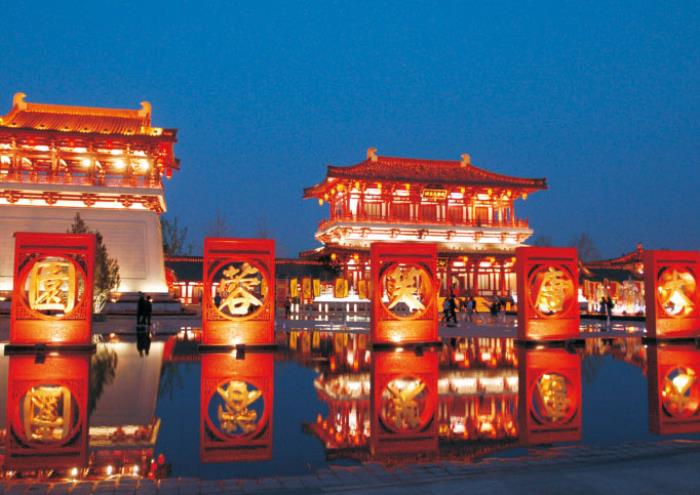 大唐芙蓉园景区位于大雁塔东南侧,它是在原唐代芙蓉园遗址以北,仿照唐代皇家园林式样重新建造的,是中国第一个全方位展示盛唐风貌的大型皇家园林式文化主题公园,大唐芙蓉园的建设立足于展现中华文明的源远流长和博大精深,景区分为14个文化区,以西安作为“盛唐之都”的辉煌历史为主线,集盛唐历史景观精华为一体,从建筑、餐饮、歌舞、音乐、民俗等多个角度,运用现代高科技手段和丰富多彩的节目,对唐代的灿烂文化进行了生动演绎和全面再现。