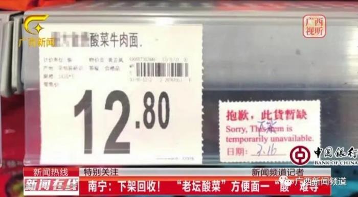 在南宁市金湖汇春路口地铁商业街里的一家连锁超市,记者看到货架上康师傅品牌其它口味的方便面仍有销售,唯独该品牌的老坛酸菜类产品不见踪影,而统一品牌的老坛酸菜牛肉面仍在销售。在南宁市兴宁区一些城郊结合部的个体便利店内,老坛酸菜方便面只有统一品牌的仍在销售。