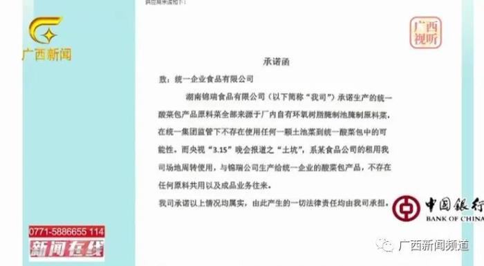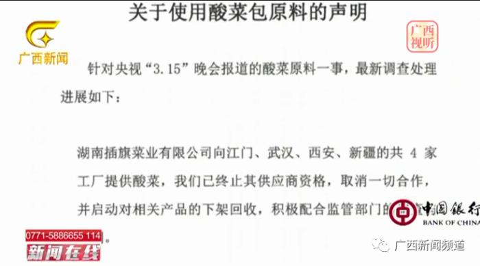 3月16日,康师傅发布声明,下架回收相关产品。同一天,统一企业在官网《致广大消费者说明函》中说明,经对湖南锦瑞食品有限公司连夜调查,统一企业酸菜包所用原料菜确认全部来源于厂内自腌自用,未使用央视“3·15”晚会报道的“土坑酸菜”。这份声明也是许多商家仍然在销售统一老坛酸菜牛肉面的原因。不过,对于消费者来说,“土坑酸菜”事件已经让酸菜类方便面的口碑跌到谷底。