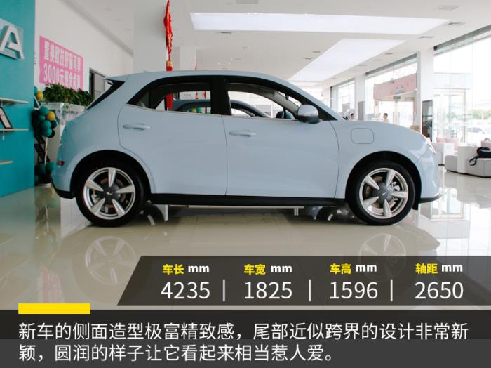 新车的侧面造型极富精致感,尾部近似跨界的设计非常新颖,圆润的样子让它看起来相当惹人爱。尺寸方面,新车的长宽高分别为4235/1825/1596mm,轴距为2650mm。