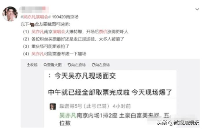 有网友称吴亦凡2019年吴亦凡在南京的演唱会,一张内场票就卖到了5位数。我真不知道吴亦凡是怎么想的,能来看你演唱会的那都是你的粉丝,能买你内场票的更是你的铁粉,5位数一张的演唱票你不觉得过分了吗?更何况你是卖给你忠诚的粉丝。