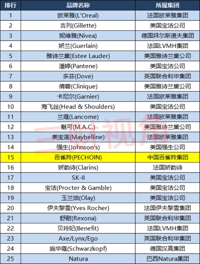 从所属企业来看,有9个品牌来自美国保洁公司,7个品牌来自英国联合利华集团,6个品牌来自法国欧莱雅集团,4个品牌来自美国雅诗兰黛公司,3个品牌来自法国LVMH集团,3个品牌来自巴西Natura集团,不难发现化妆品和个人护理品牌的集中度非常之高,欧美几个发达国家已经形成了头部垄断,而且强强联合的趋势非常明显。