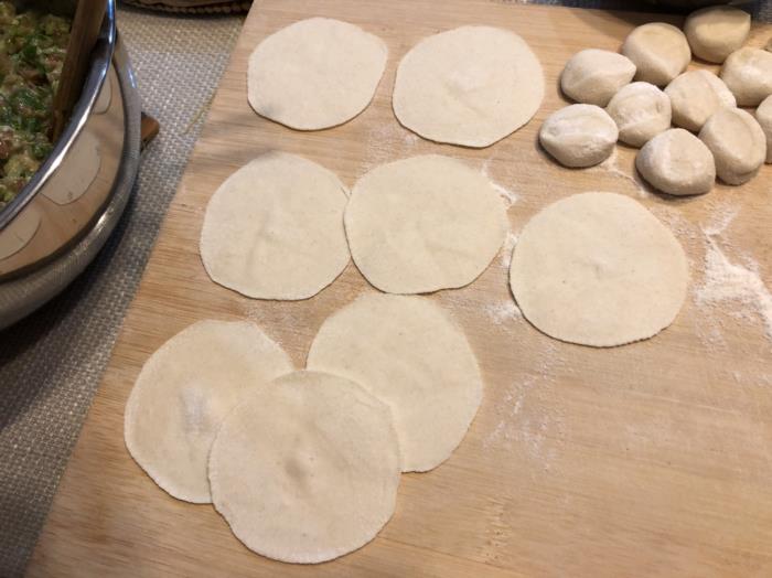 和面,揪剂子,擀成饺子皮,舀入适量的馅料,开始包饺子。