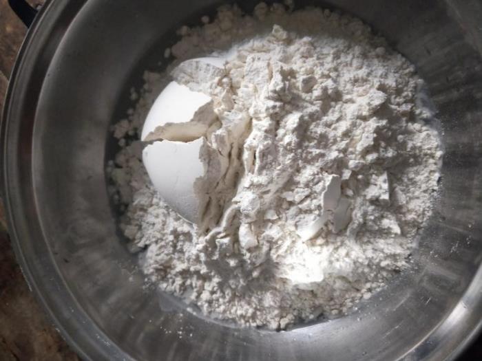 包饺子和面,无需酵母粉,准备一斤中筋面粉,边倒水边搅拌,等出现大面絮的时候,下手和成光滑的面团。