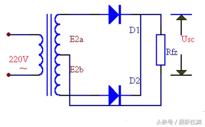 为了充分利用电能,于是人们对电路结构进行调整,在原先一个二极管的基础上,再增加一个二极管▼