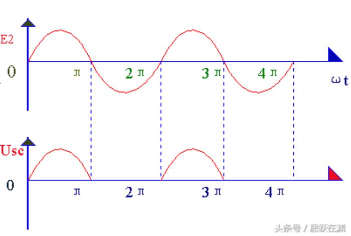 上图中的波形,就是交流电经过二极管后变成的样子,可以看出,电流的方向已经固定了(电流方向固定,就是直流电)。一组完整的交流电流波形,是向上和向下两个对称的波形。而只用了一个二极管进行整流的电路,只能获取其中一半的波形,这就叫做半波整流。