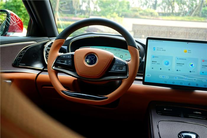 再来看看内饰的“装修设计”,和其他汉系列的产品一样,依旧是中式美学风格,并且在整个内饰的用料和做工上绝不含糊,环抱式的内饰氛围所营造出来的豪华感还是很强烈。中控部分,面对驾驶位的仪表盘采用的是12.3英寸的全液晶屏幕,中控的中心位置安置了一个带旋转功能的15.6英寸大屏,并且已经升级到了Dilink4.0系统,该系统已经拥有最新的UI界面,美观且操作起来更为流畅。副驾驶位的中控面板配备BYD Heart龙擎之心以及无级变色龙鳞副驾面板,整体营造出十足的环抱感氛围与更富高级感的空间层次。