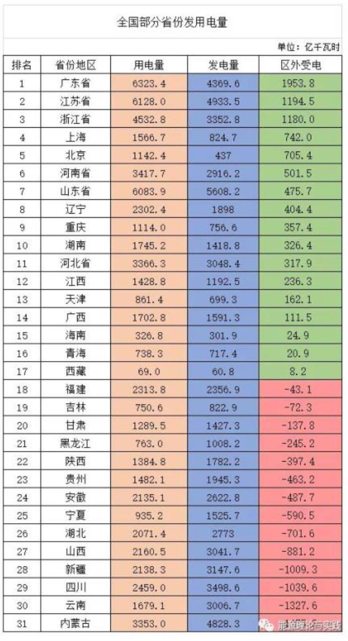 从各省(市)发用电量看,电力资源分布与需求呈逆向分布特征明显,2018年各省区外受电量总和8723亿千瓦时,占当地总发电量20.4%。广东、江苏、山东省用电量位居前三,山东、江苏、内蒙古发电量位居前三,广东、江苏、浙江省区外受电量位居前三,北京、上海、重庆区外受电占用电量的比重位居前三。