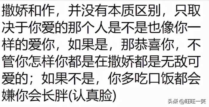 让我来告诉你们撒娇和作的区别,撒娇就是说说好话软话就能达到目的,而作就是你不仅达不到目的还要挨顿揍。不是在男人那学来的,是在我妈那学来的。所以撒娇真的很实用,建议姐妹们都学起来。